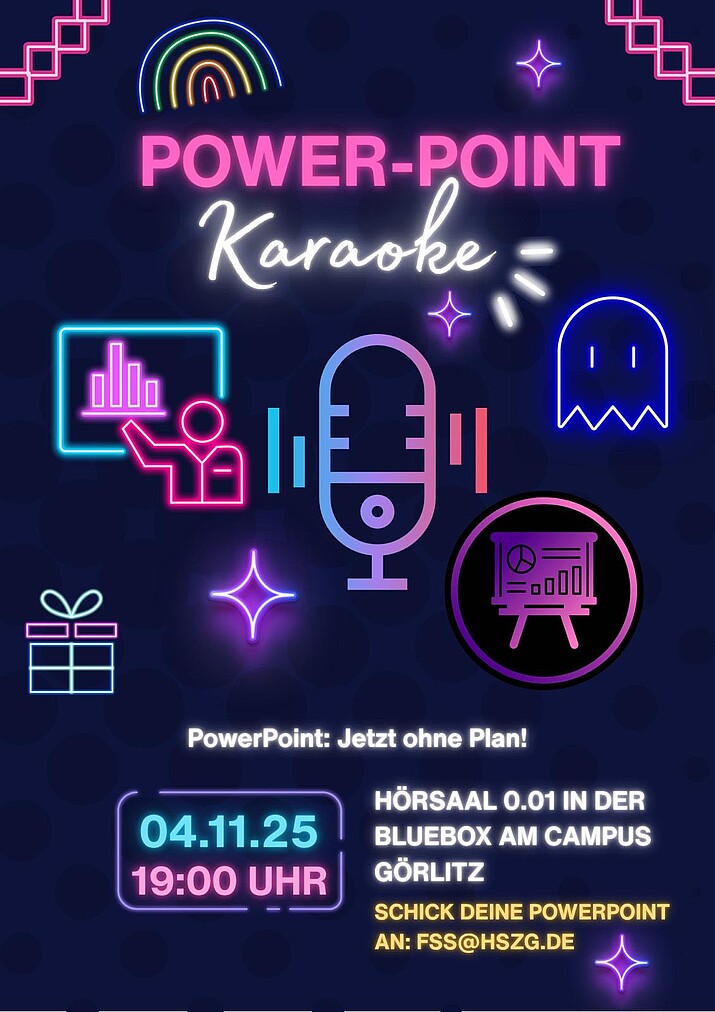 Dann komm am 04.11.2025 um 19:00 Uhr in den Hörsaal 0.01 in der G1 zum PowerPoint-Karaoke und zeig uns, was du drauf hast!