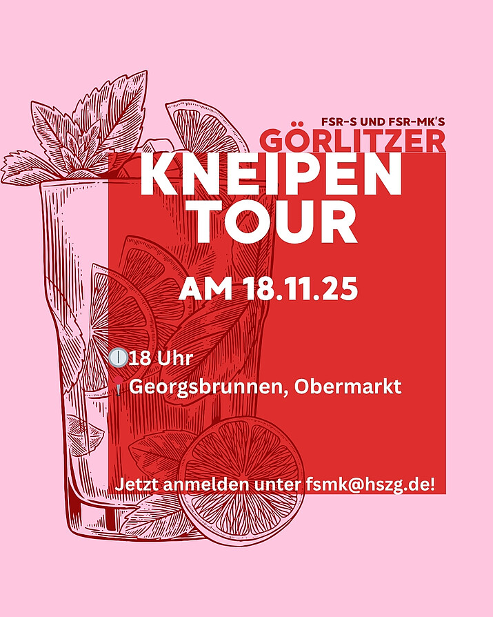Freunde der Nacht und des guten Geschmackes, es ist wieder so weit! Zeit für die wildeste Kneipentour, die Görlitz jemals erlebt hat! Dieses Jahr laden FRS-MK und FSR-S zu einem Abend mit vielen Kneipen und unendlichen Erinnerungen ein.