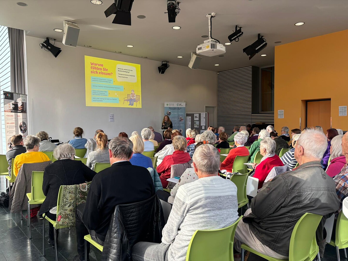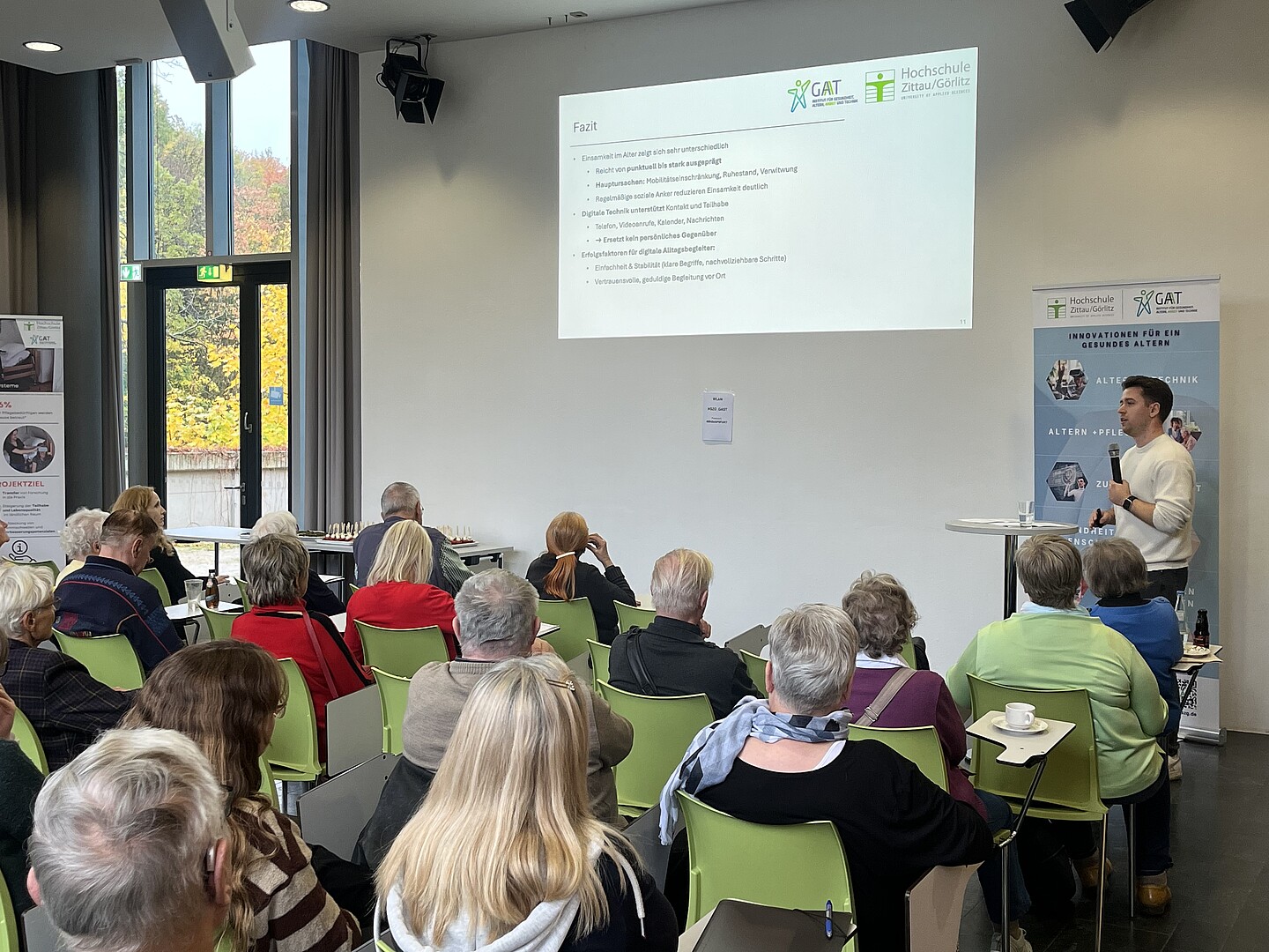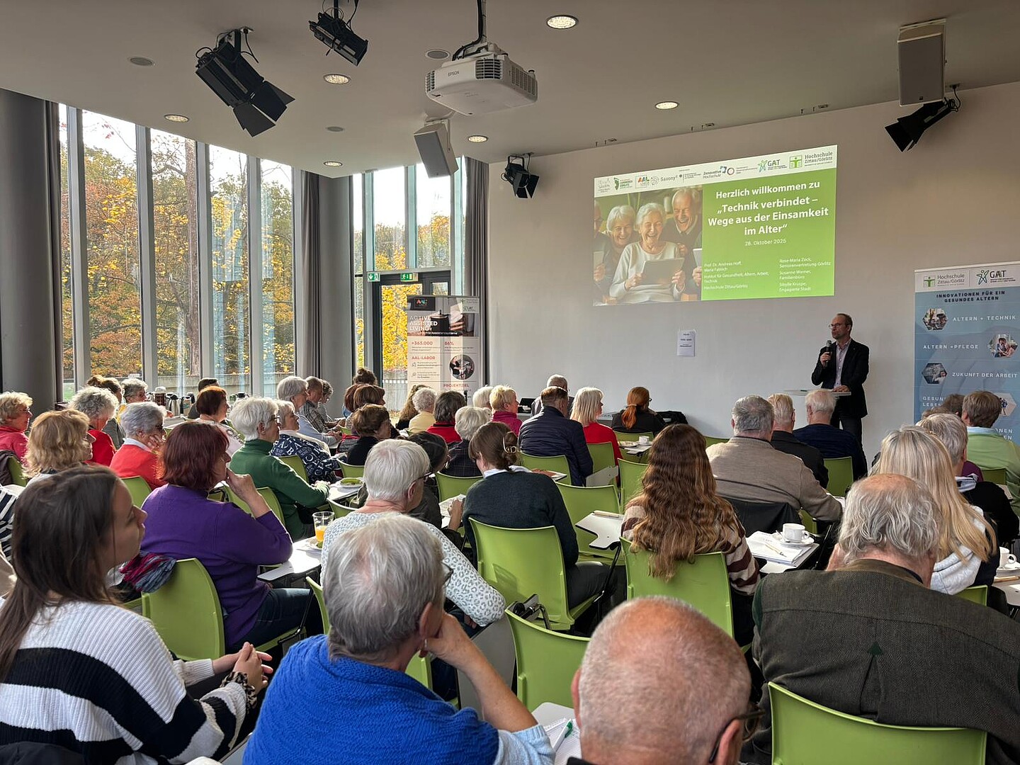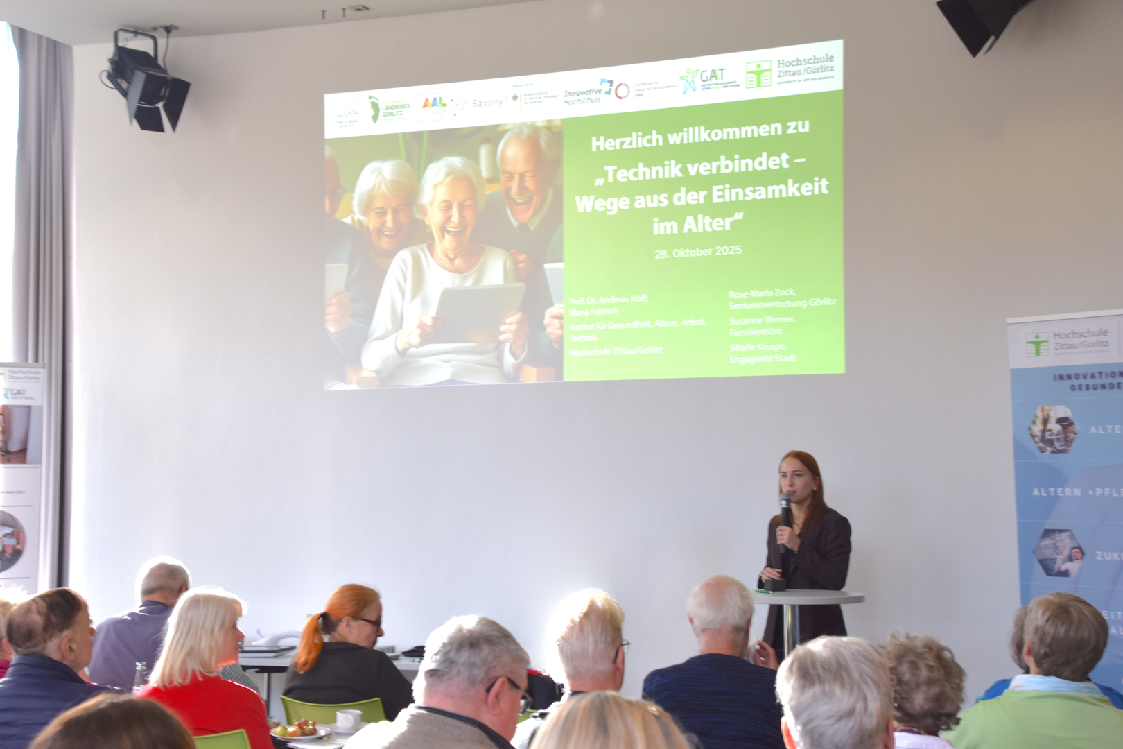 Nach der Begrüßung durch Maria Fabisch und Rose-Maria Zock von der Seniorenvertretung Görlitz, eröffnete Prof. Dr. Andreas Hoff, Direktor des GAT-Institutes mit einigen Worten zum Thema Einsamkeit den Vormittag. Er betonte, dass Einsamkeit nicht nur ein individuelles, sondern auch ein gesellschaftliches Thema sei – und dass Technik, richtig eingesetzt, helfen könne, soziale Teilhabe zu fördern und Brücken zwischen Generationen zu schlagen. Anschließend stellten Susanne Werner vom Familienbüro Görlitz und Sibylle Kruspe von der Engagierten Stadt Görlitz die Ergebnisse ihrer durchgeführten Umfrage vor, welche die Gründe für Einsamkeit von Seniorinnen und Senioren aufschlüsselte und gleichzeitig ein großes Interesse an niedrigschwelligen Angeboten im Umgang mit Technik offenlegte.
