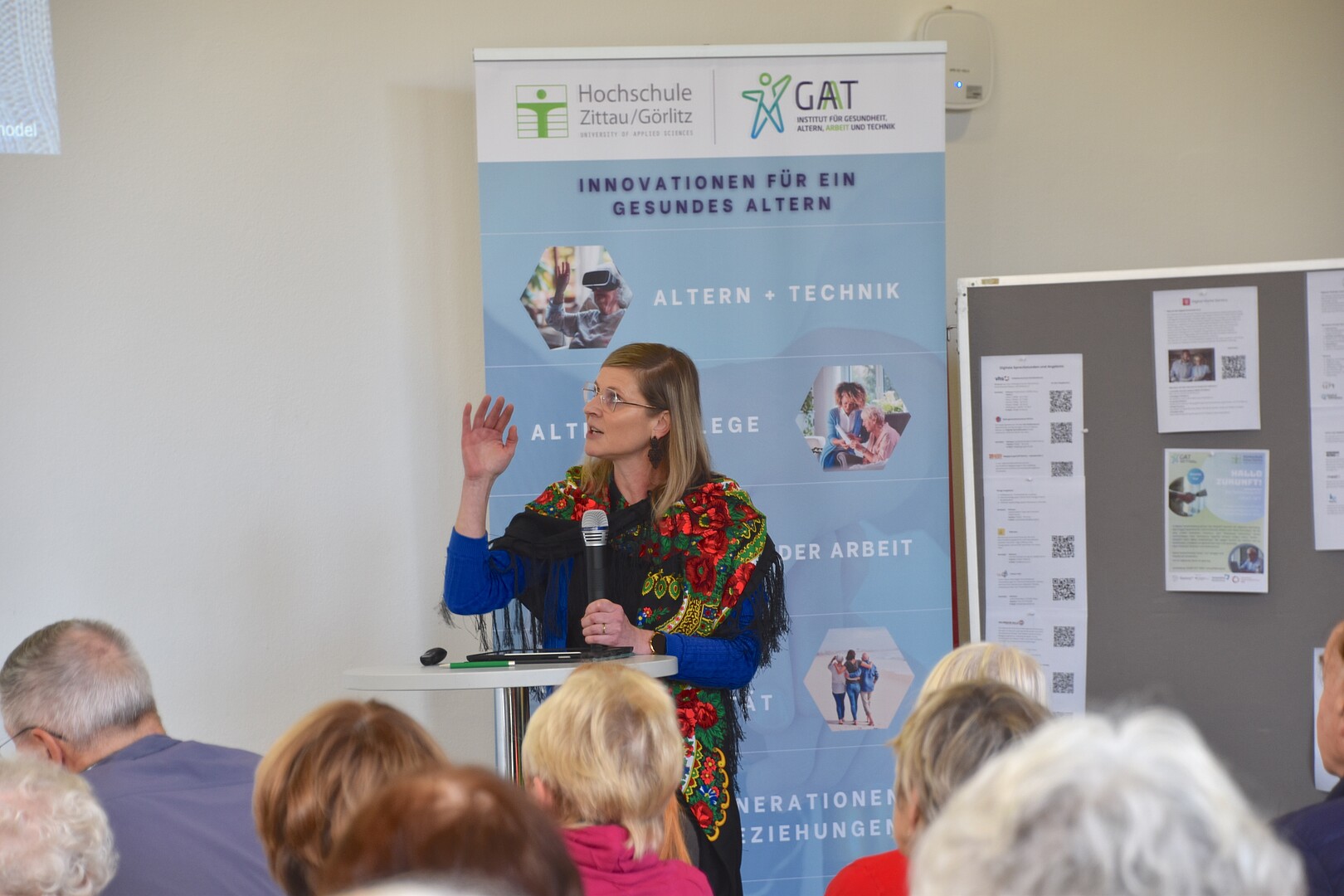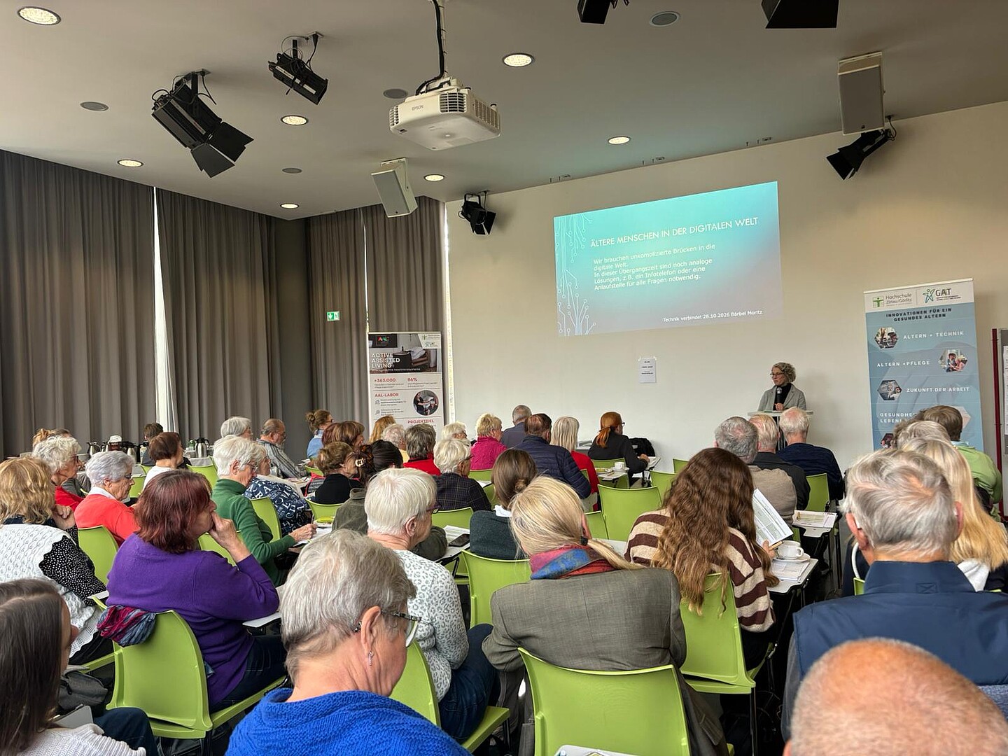 Am 28. Oktober 2025 fand in der Hochschule Zittau/Görlitz eine Veranstaltung rund um digitale Teilhabe im Alter statt. Über 60 Seniorinnen und Senioren sowie Fachakteurinnen und -akteure aus den Bereichen Technik- und Medienkompetenz, Pflege, Sozialarbeit, Wissenschaft und Zivilgesellschaft kamen zusammen, um sich über Chancen, Herausforderungen und praktische Ansätze im Umgang mit digitalen Technologien auszutauschen.