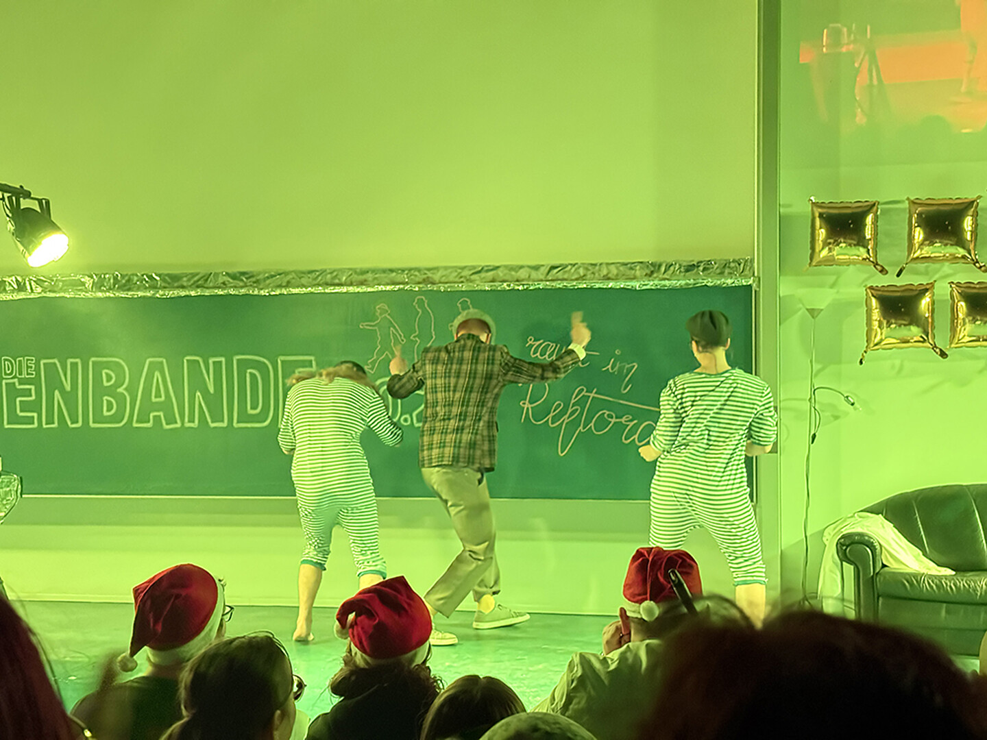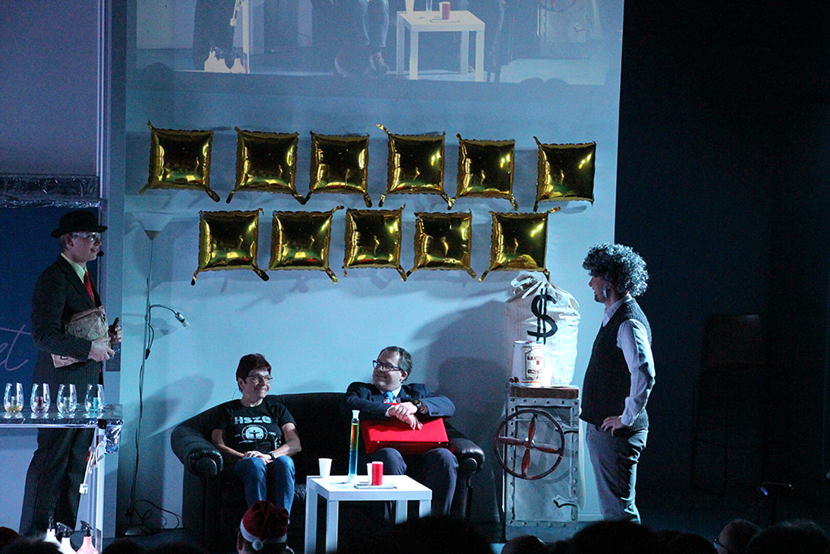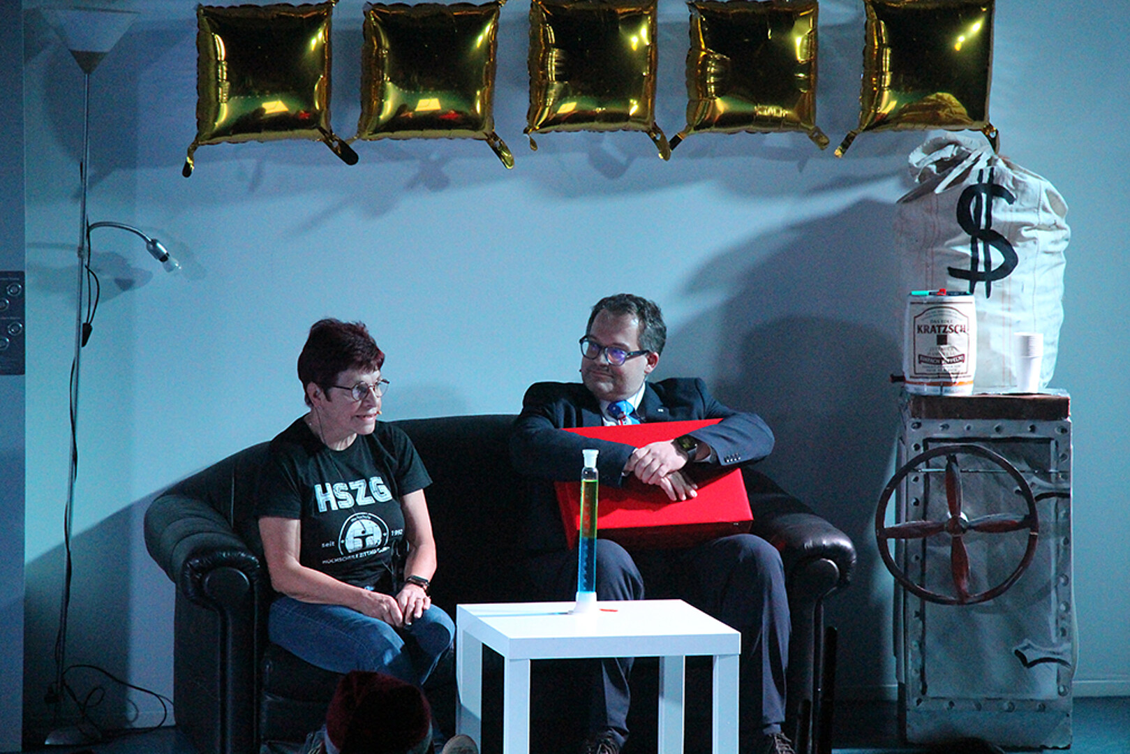 Mit dabei war ein ganz besonderer Gast: Die ehemalige Kanzlerin Karin Hollstein ließ es sich nicht nehmen, persönlich der Olsenbande auf die Spur zu gehen und sich mit dem Rektor auf der Ledercouch bei „Kratzsch und Tratzsch“ zusammenzusetzen.