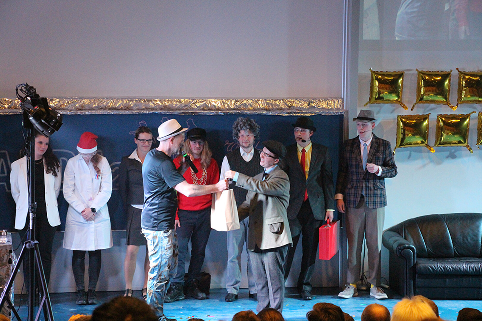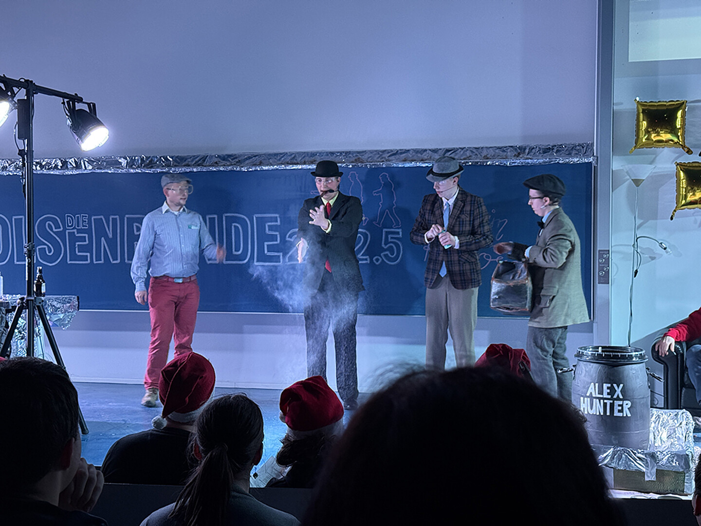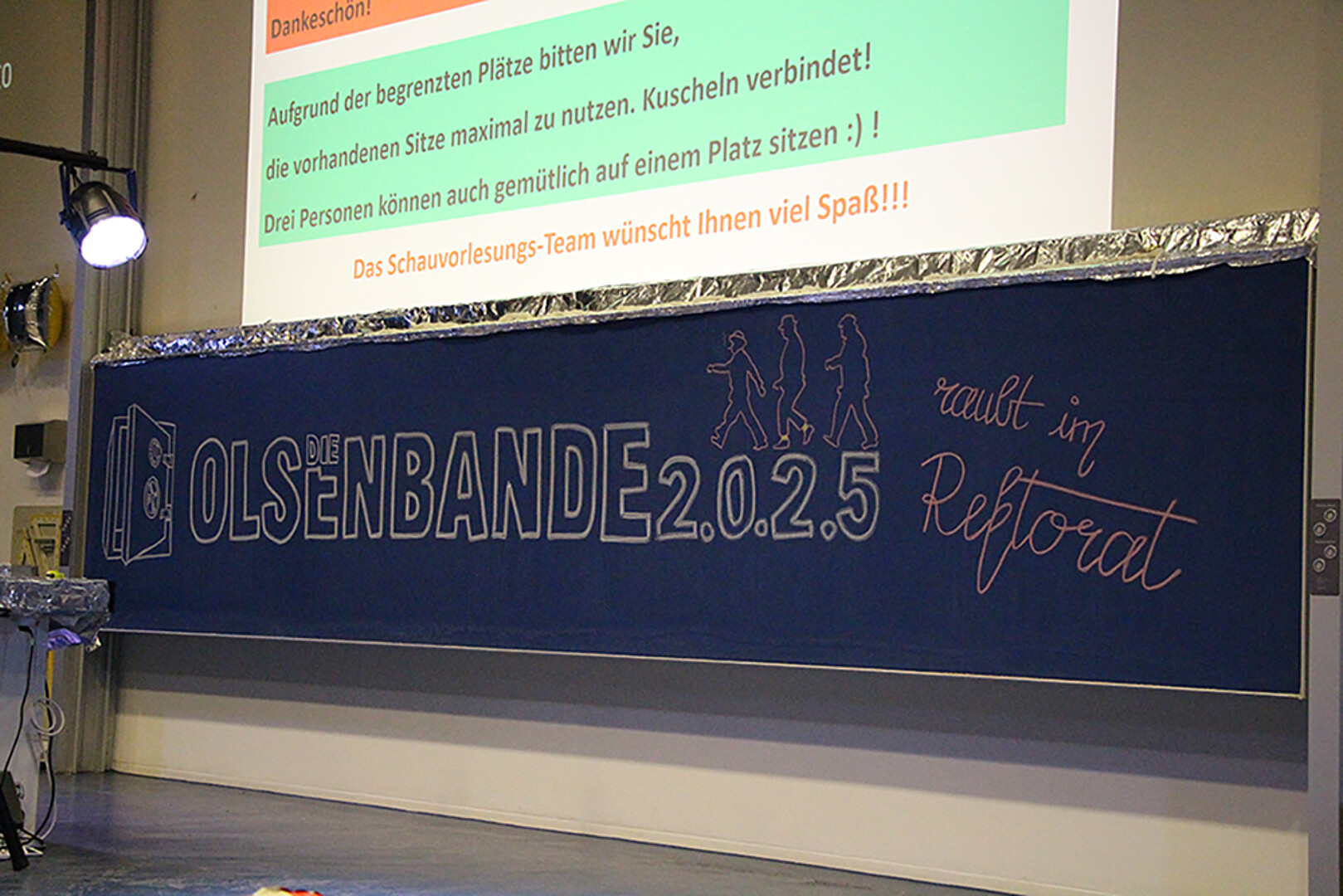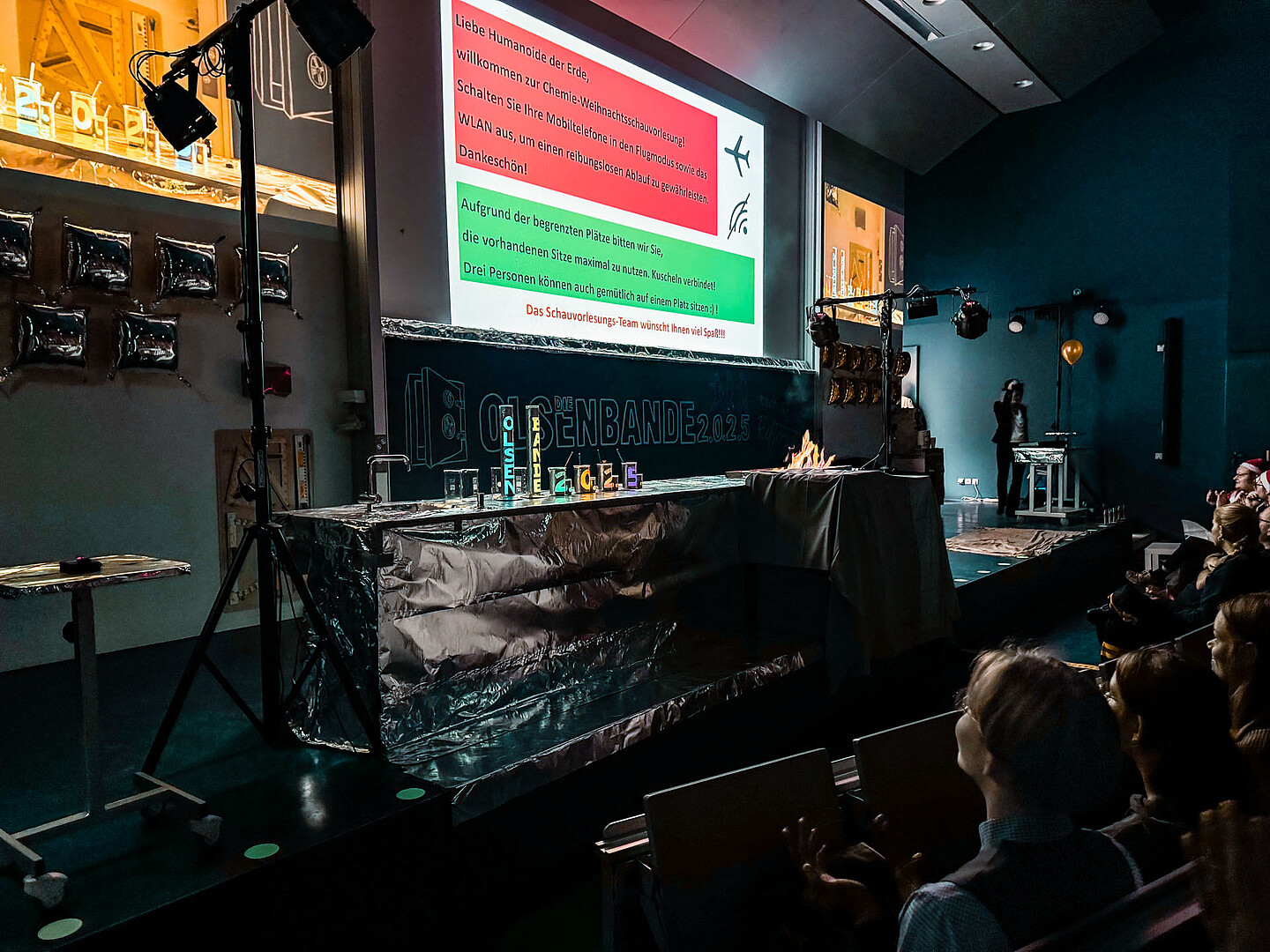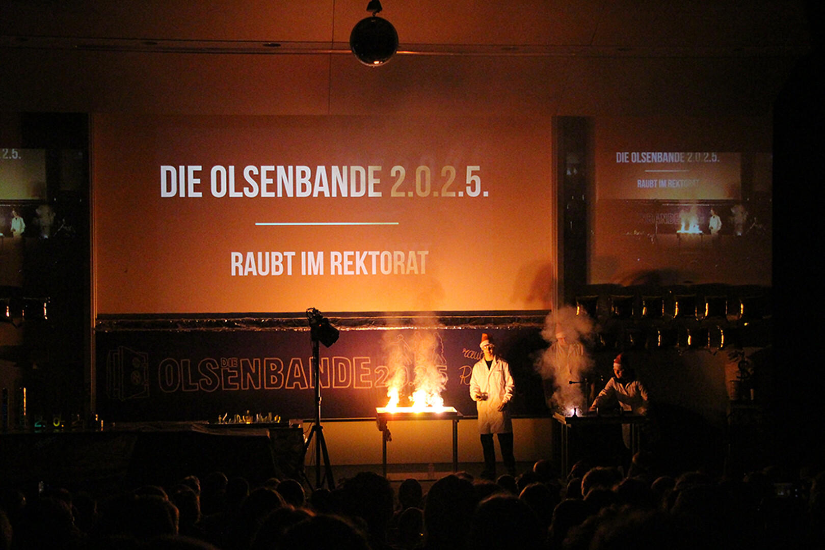 Am 8. Dezember 2025 war es nun so weit: Egon Olsen wurde entlassen – und kehrte mit seiner Bande zurück auf die Bühne der Chemie-Schauvorlesung im voll besetzten Audimax Zittau. Unter dem Motto „Die Olsenbande 2.0.2.5. raubt im Rektorat“ erlebten mehrere hundert Gäste eine Mischung aus Hochschultheater, Slapstick und atemberaubender Chemie.