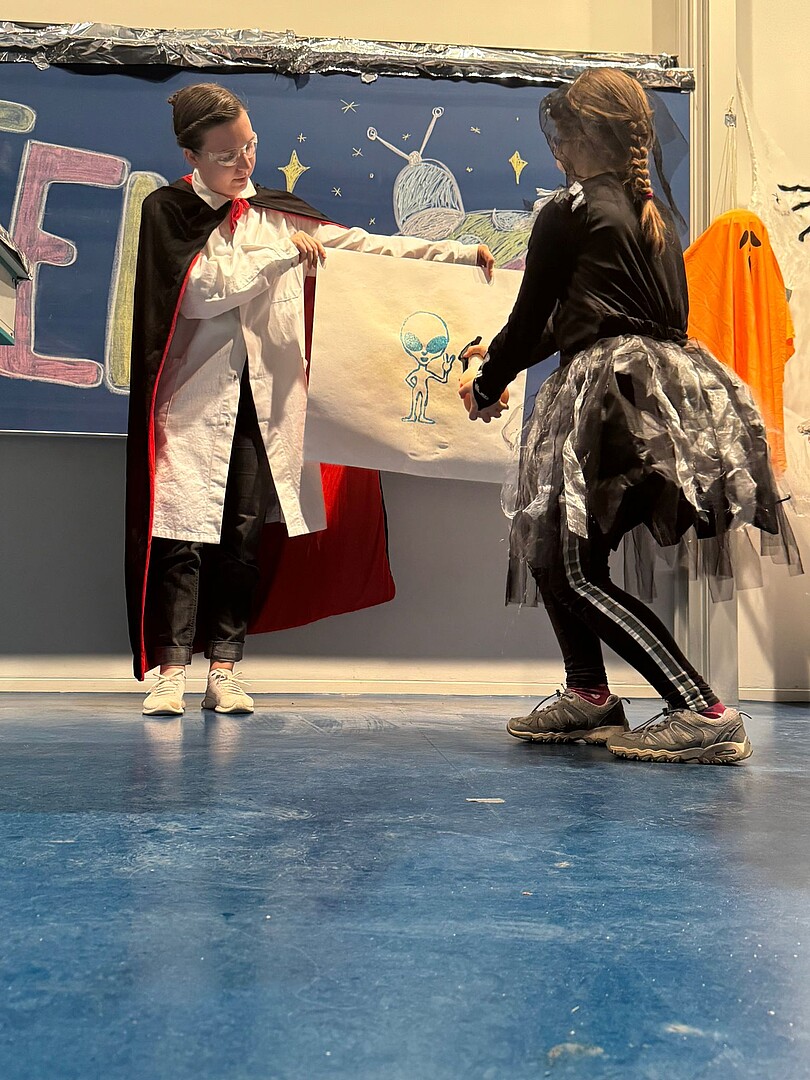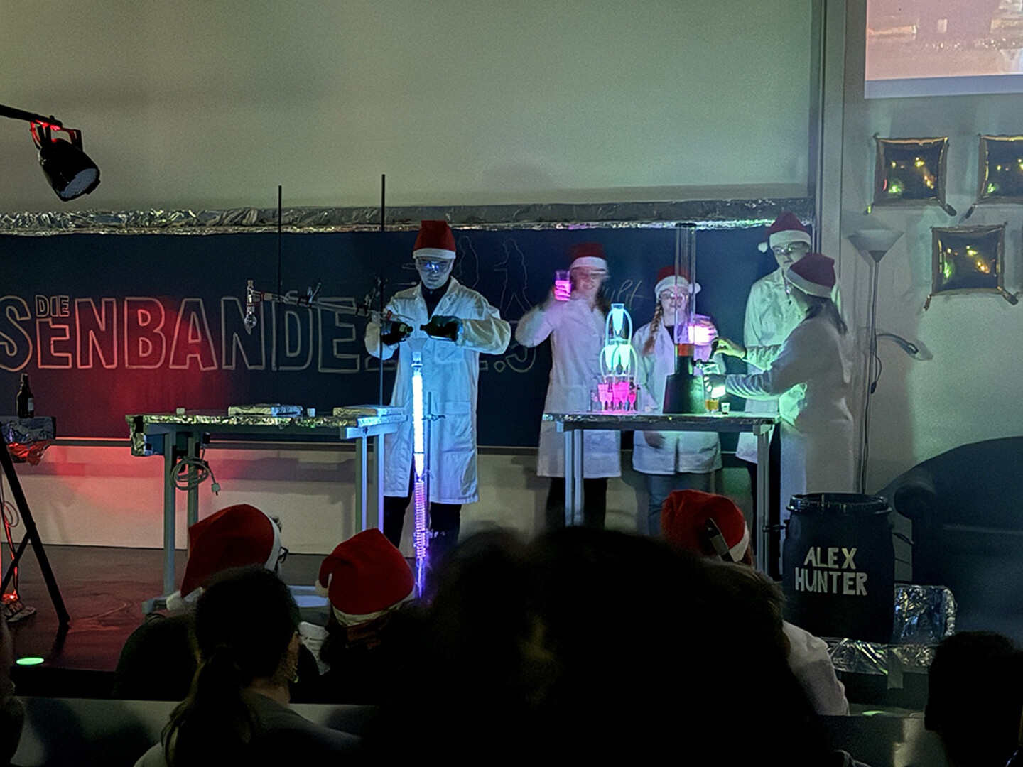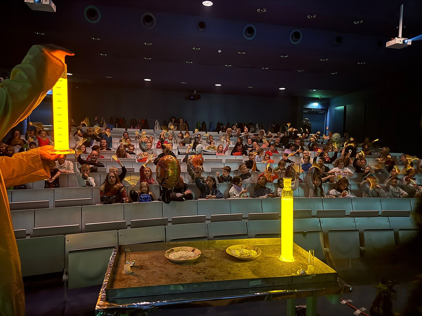 Mit seinem Geisteraktivitätszähler ging ein Geisterjäger auf Spuk-Spurensuche und löschte alle fragwürdigen, extraterrestrischen Aktivitäten aus, die der Außerirdische Nano vom Planeten X bei seinem Besuch hinterlassen hatte. Geisterhände lösten sich auf magische Weise auf und ein neonfarbiges Lichtspektakel sorgte für staunende Kindergesichter. Mit 150 Kindern war die Kinder-Chemieschauvorlesung so gut besucht wie noch nie.