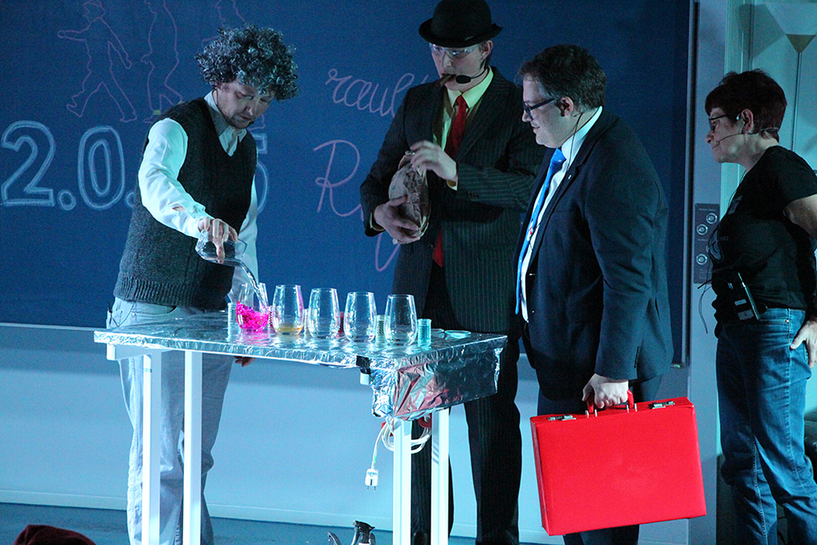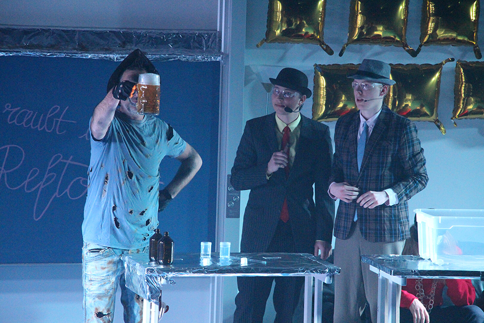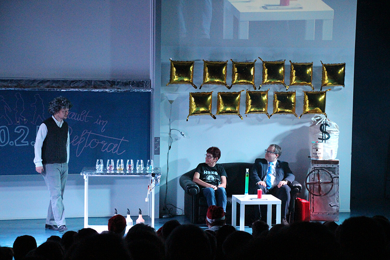 Die Antwort lieferten die Studierenden und Lehrenden der Fakultät Natur- und Umweltwissenschaften in einem fulminanten Bühnenprogramm, das klassische Elemente der beliebten Schauvorlesungen aufgriff und neu inszenierte. Dazu gehörten: