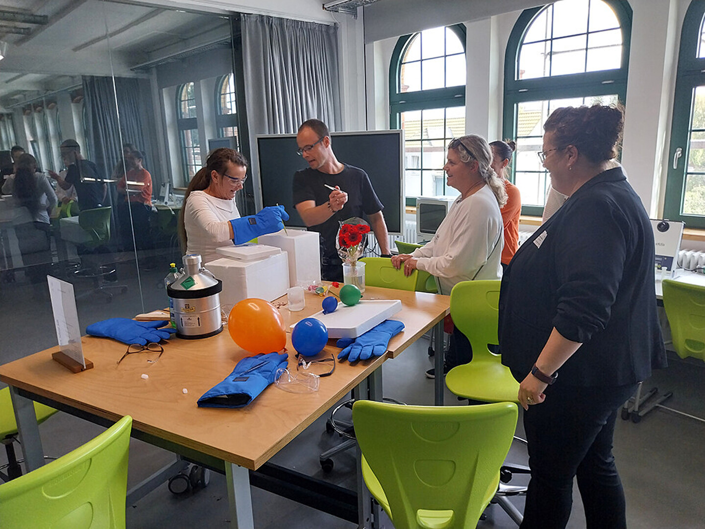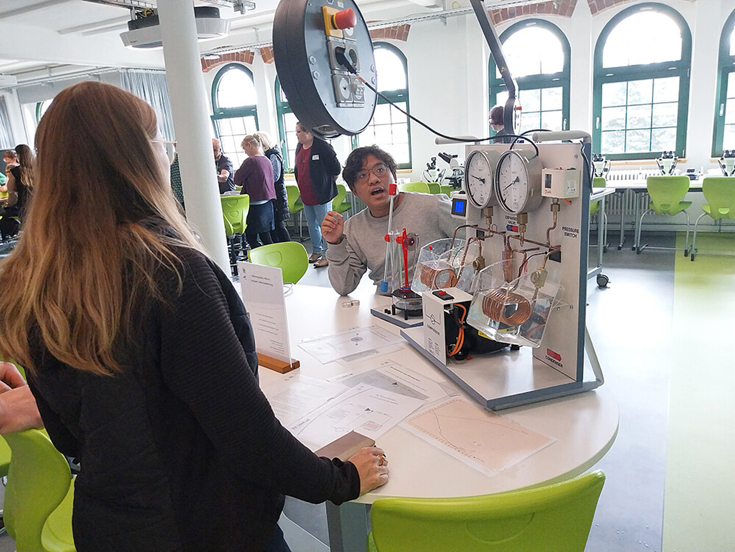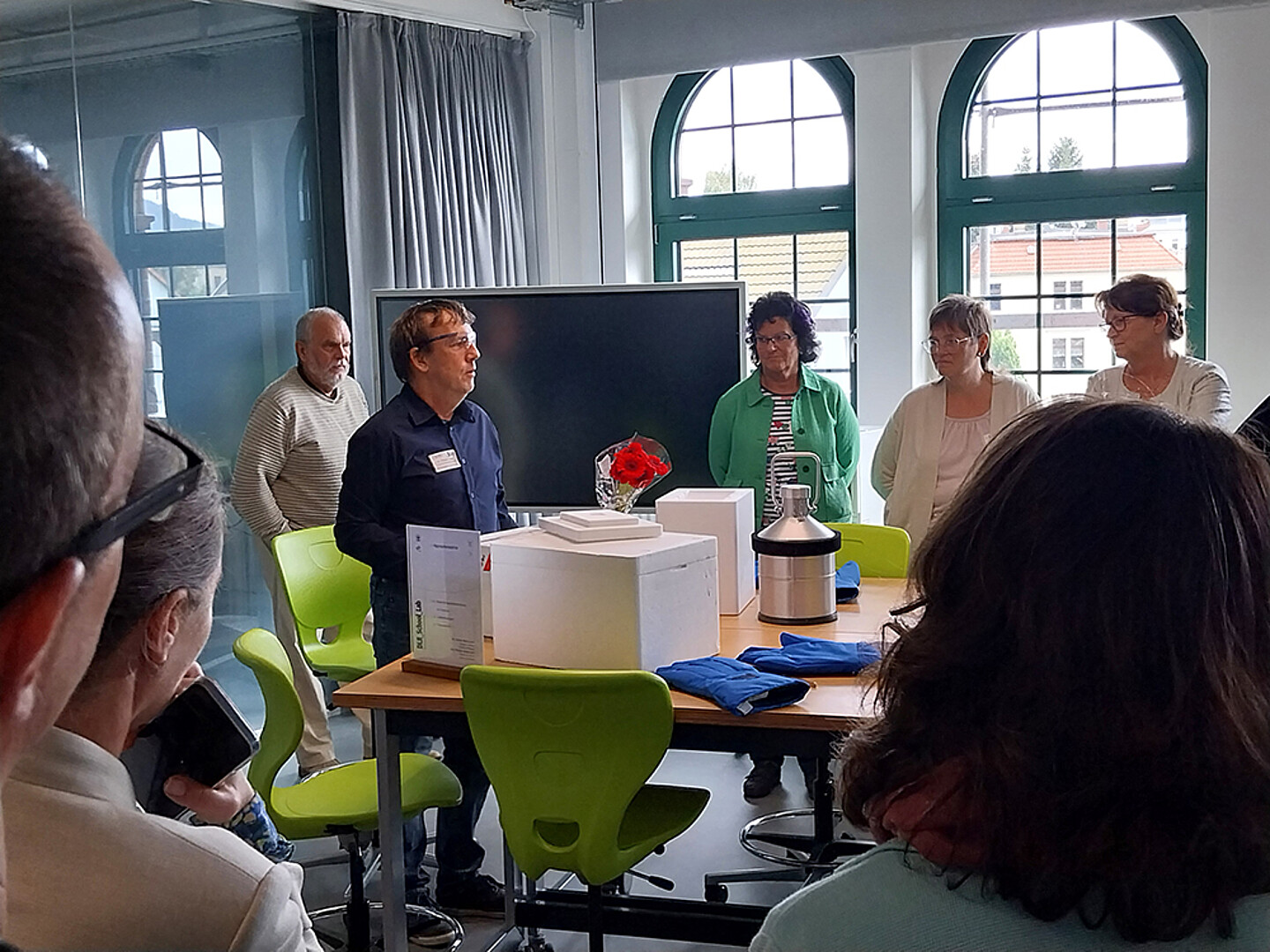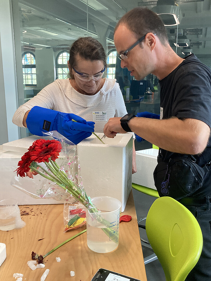 Im Anschluss an das Vortragsprogramm hatten Teilnehmende die Gelegenheit, die Juniorakademie Zittau mit dem DLR_School_Lab Hochschule Zittau/Görlitz zu erkunden. Nach einer kurzen Einführung ging es auf einen Rundgang durch das Labor. Dort konnten die Teilnehmenden sechs spannende Experimentierstationen entdecken, etwa zu den Aggregatzuständen mit flüssigem Stickstoff und Trockeneis, zur Atmung bei Menschen und Hefe, zur Fluoreszenzmikroskopie, Wärmepumpe, Pipettiertechnik und Dünnschichtchromatographie.