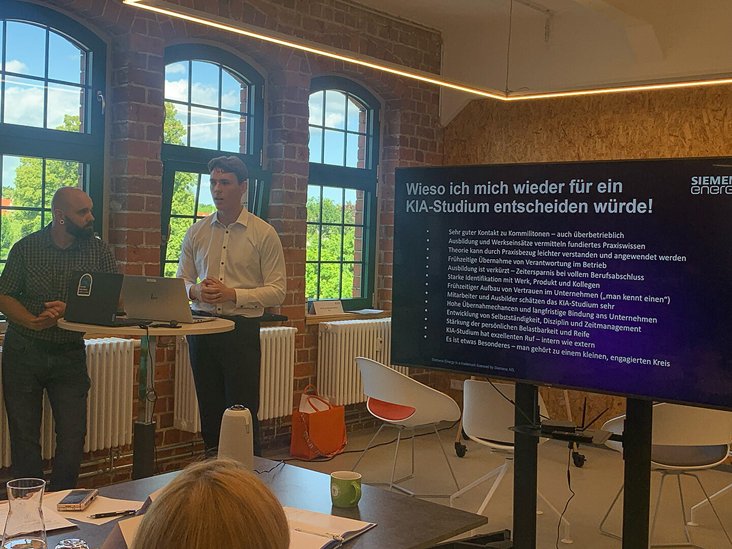 Zu den Gästen des Workshops zählte auch Siemens Energy – ein langjähriger und geschätzter KIA-Partner der HSZG. Janek Tiefel, Lernprozessbegleiter und Ausbildungsleiter von Siemens Energy, sowie der KIA-Studierende Martin Alexander Schlemmer gewährten wertvolle Einblicke in die gelebte Praxis der dualen Ausbildung. Sie berichteten über erfolgreiche Kooperationsmodelle und zeigten auf, wie die Integration von KIA-Studierenden im Unternehmensalltag gelingen kann. Besonders eindrucksvoll schilderte Martin Alexander Schlemmer seine persönlichen Studien- und Praxiserfahrungen und machte deutlich, warum er sich immer wieder für das KIA-Studium an der HSZG entscheiden würde. Die Beiträge von Siemens Energy dienten als praxisnaher Impulsgeber für die anschließende Diskussion mit Infineon.