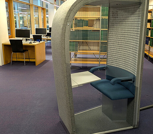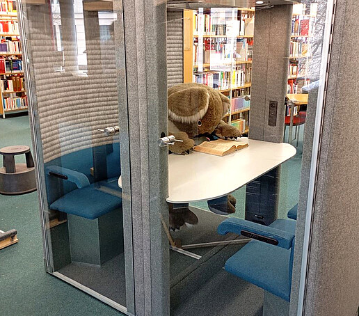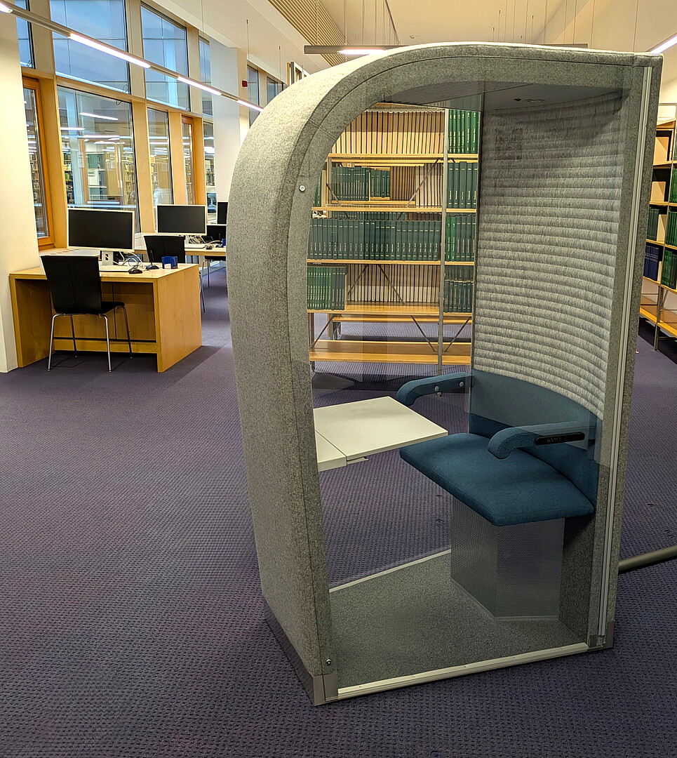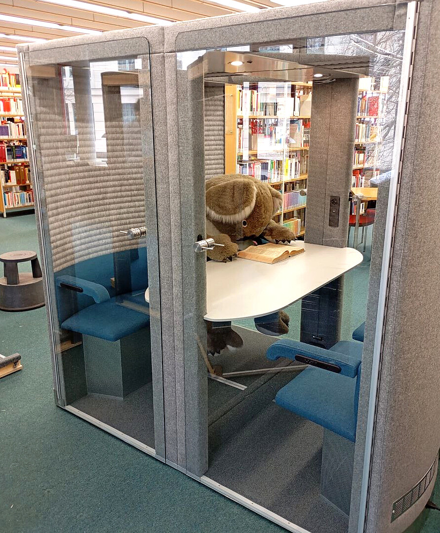 Noch vor den Weihnachtsferien konnten wir in der Hochschulbibliothek Görlitz unsere zwei neuen Flüsterboxen aufbauen. Die schallisolierten Mini-Gruppenarbeitsräume können gern für Teamarbeiten, Besprechungen oder Videokonferenzen genutzt werden. Steckdosen und USB-Anschlüsse sind integriert.