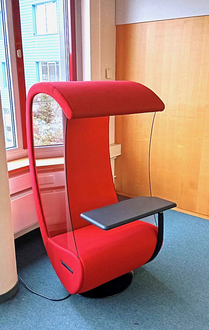 Als neuer Einzelarbeitsplatz steht in Görlitz auch der rote Akustik-Sessel zur Verfügung. Er mindert die Umgebungsgeräusche, sodass man fokussiert am Laptop arbeiten, oder einfach mal in Ruhe ein Buch lesen kann.